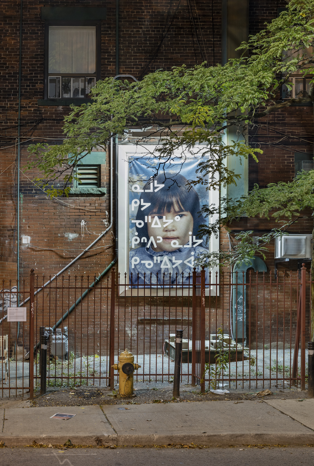 kiya itako (be you) presents two mirrored Nēhiyawēwin (Plains Cree) phrases written in syllabics. One phrase, set atop a prairie sky, is installed outside of MOCA Toronto; the other, on a childhood photograph of Arcand, is installed outside Mercer Union. The two sentences come from words spoken by Joi T. Arcand's mentors, offering contradictory descriptions of Arcand's "authenticity" as a Cree woman and as a second-language learner of Nēhiyawēwin. The words speak of the importance of language to cultural identity and of the anxieties, hope, struggle and loss surrounding that relationship.