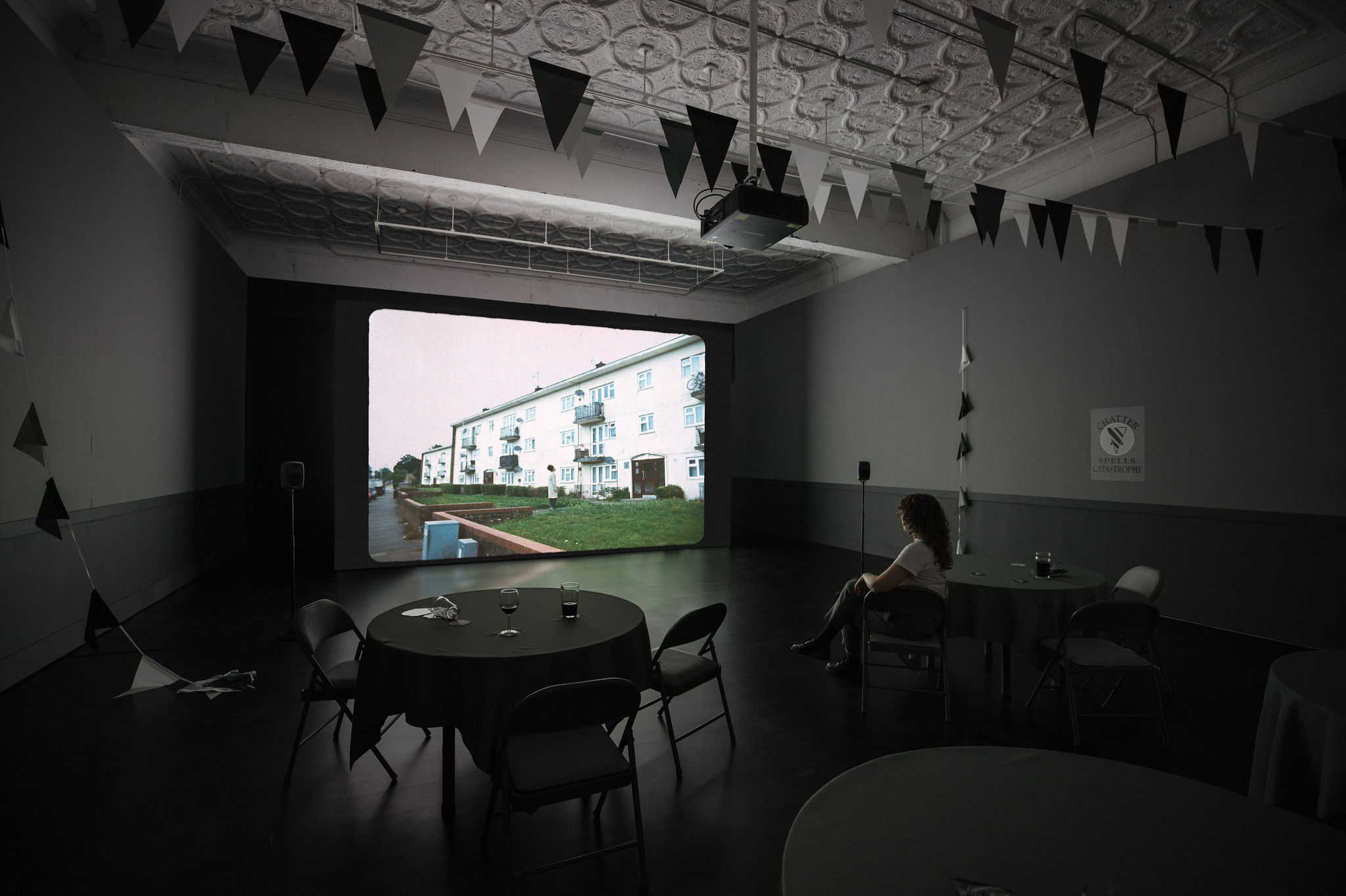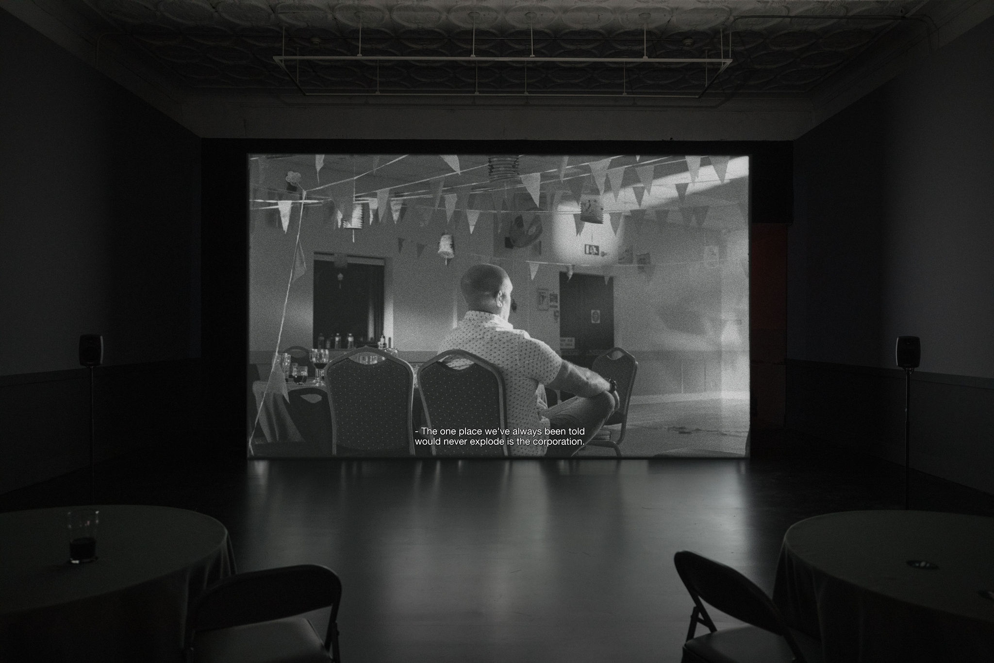 Filming in 16mm with an ensemble of non-actors and family, Hemel blurs fiction and documentary to expand a critical reading of the colonial overtones in the original movie, while recasting its visual language to consider the race, class, and labour dynamics of a small English town in the post-Brexit context. As she excavates recent events, historical archives, and personal histories that have transformed Hemel Hempstead, an encroaching dark flood, a growing shadow, a rising plume of smoke build layers of mystery throughout the work. Rows of identical housing, uniformed workers, and emptied lots signal an eerie tone within the mundane, drawing connections between the post-war ideals of the development corporation that established the town, and the mega-corporations shaping life and industry today.