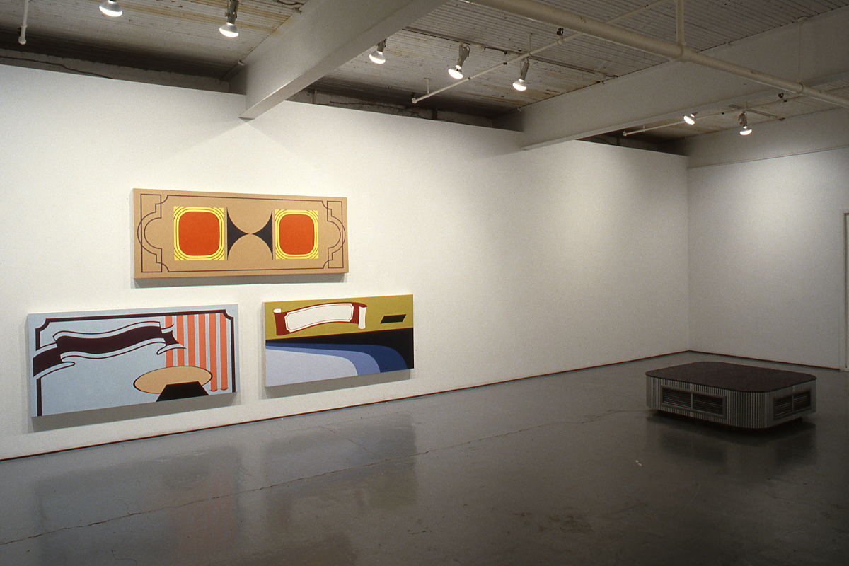 Eric Glavin's paintings and sculptures consider similar perceptual processes. He works with a palette of shapes and colours culled from the advertising and signage which constitute the visual language of the everyday. The scale of his paintings make them signs-of-sorts reminiscent of those which adorn storefronts everywhere. The considerable thickness of his stretcher frames creates a subtle physicality, further implying the structure of commercial signage. Unlike most signage, however, the paintings contain no textual elements, relying instead upon the vague familiarity of the formal elements themselves.