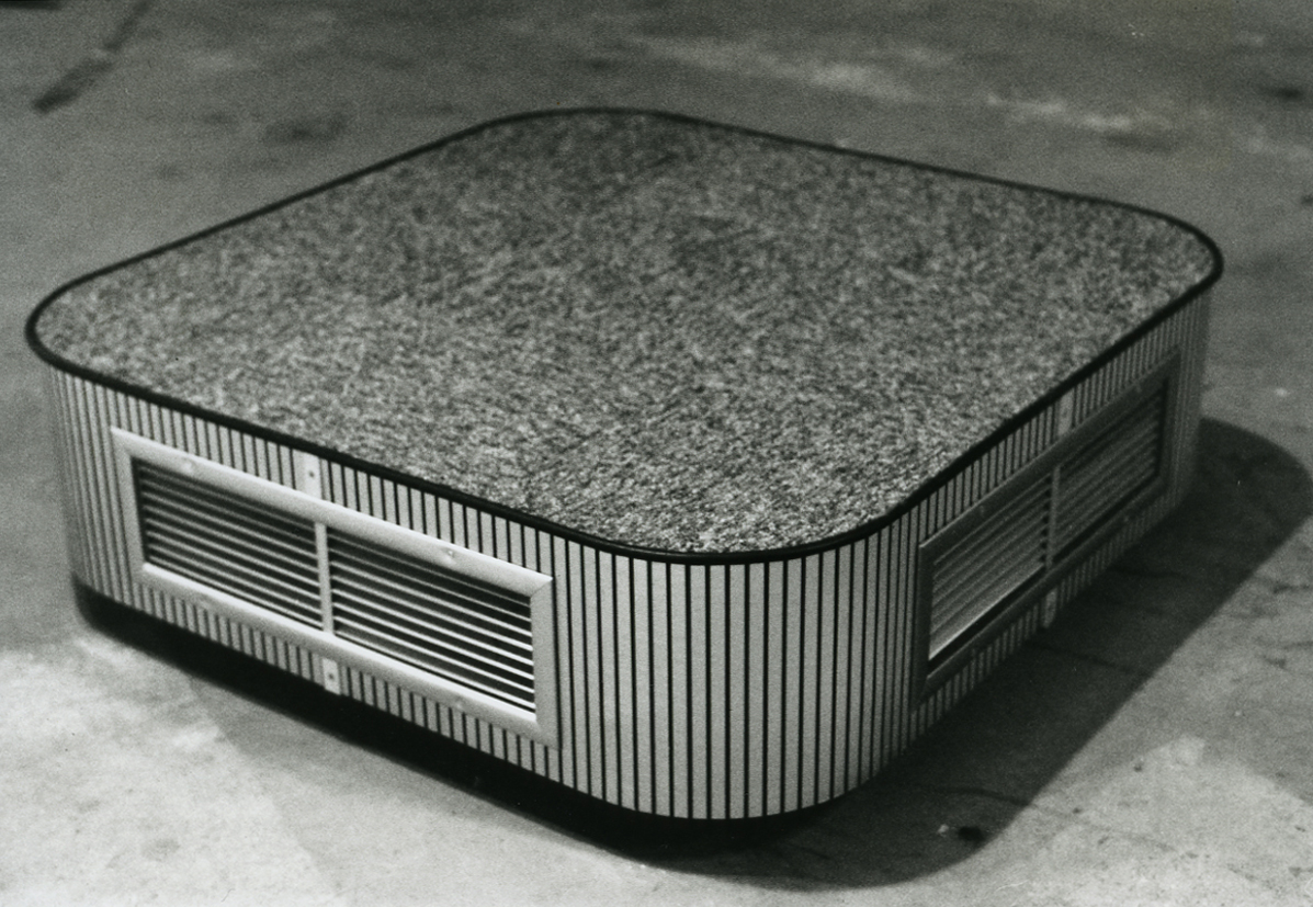 Rubber moulding, aluminium air grills, laminate siding, and the blue-grey low pile carpeting of a million office complexes all come together as one vaguely-utilitarian platform in one of Glavin's sculptural works. His sculptures mimic furnishings in malls and lobbies and question the purposeful functionality of such objects. These works --like the green, mock-leather furniture thing allow Glavin to address the blandness of functional materials and design.