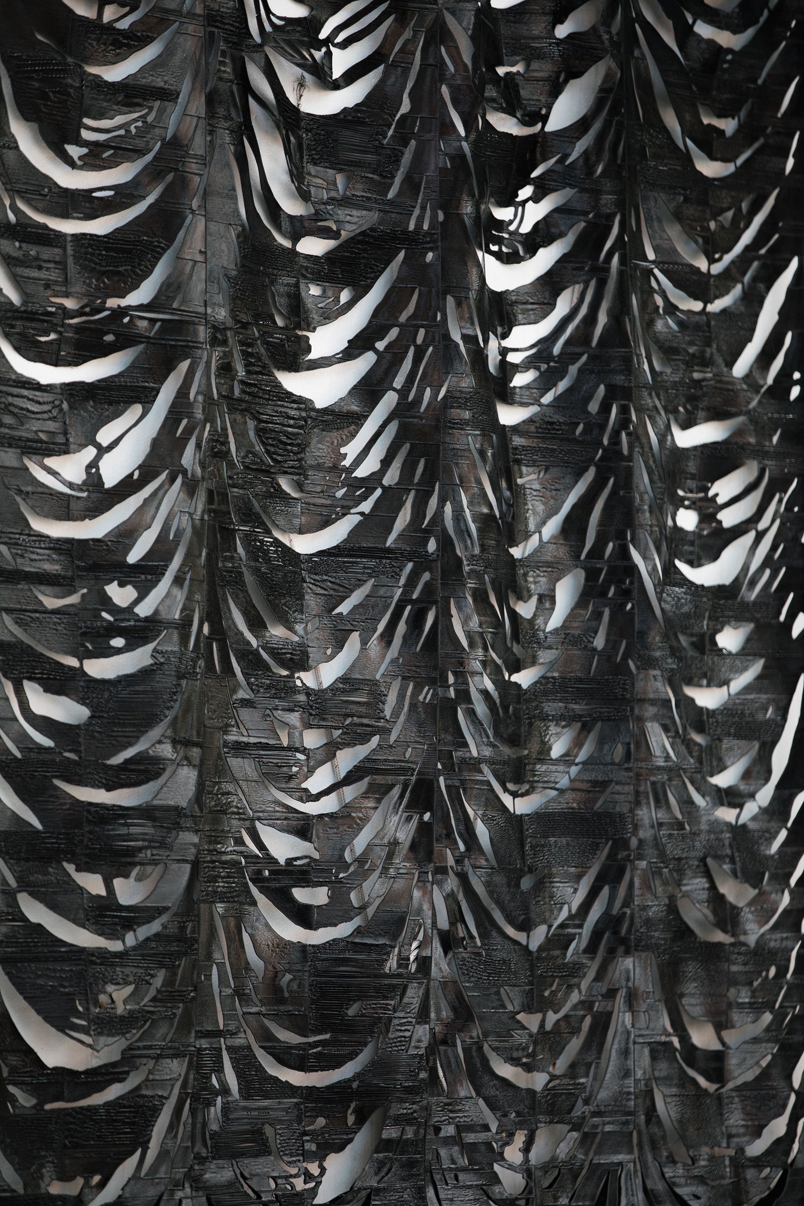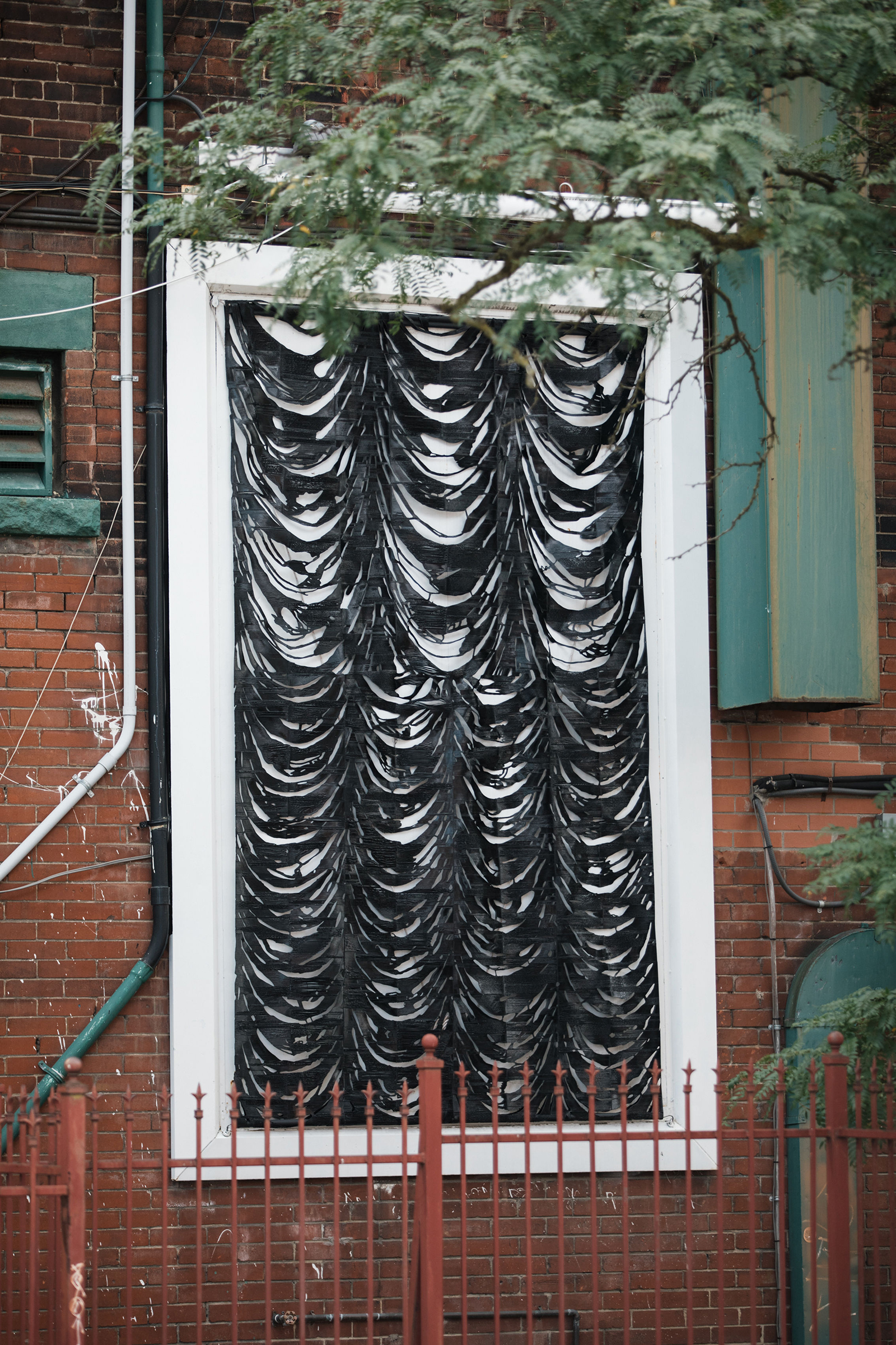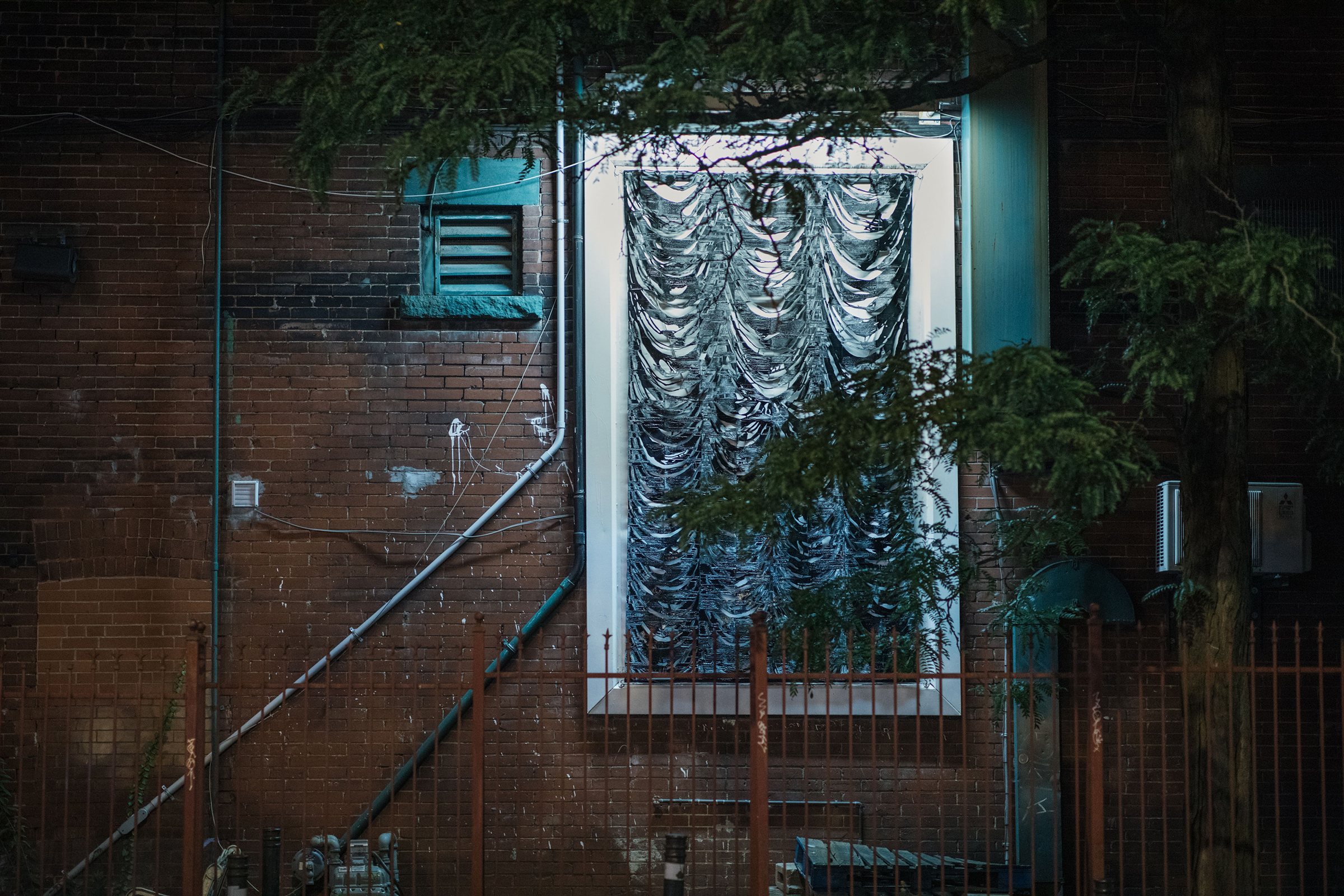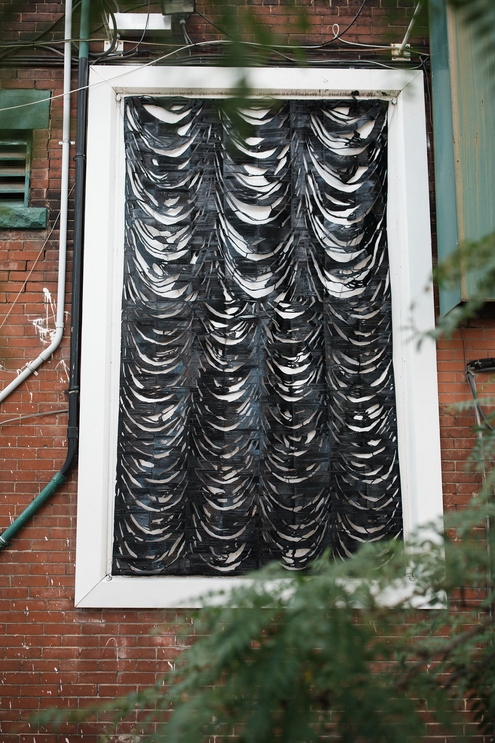 Working with materials such as photo emulsion, plastic filament, and various sheer fabrics, Jealousy presents three sculptural works, each forging an impression of the one before to form a series of abstracted theatrical drapes. Prompted by the history of Mercer Union’s building as a cinema in the early part of the last century, these works come together as adverts for a fictional premiere: a new film adaptation of Alain Robbe-Grillet’s 1957 novel La Jalousie. Noting the double-meaning of the title (“jealousy” or “louvered window”), Kubba attunes to the history and architecture of the building, taking cues from the various mediating forms punctuating its façade—vents, chutes, and other porous passages—that elicit transgression and permit the senses to travel.