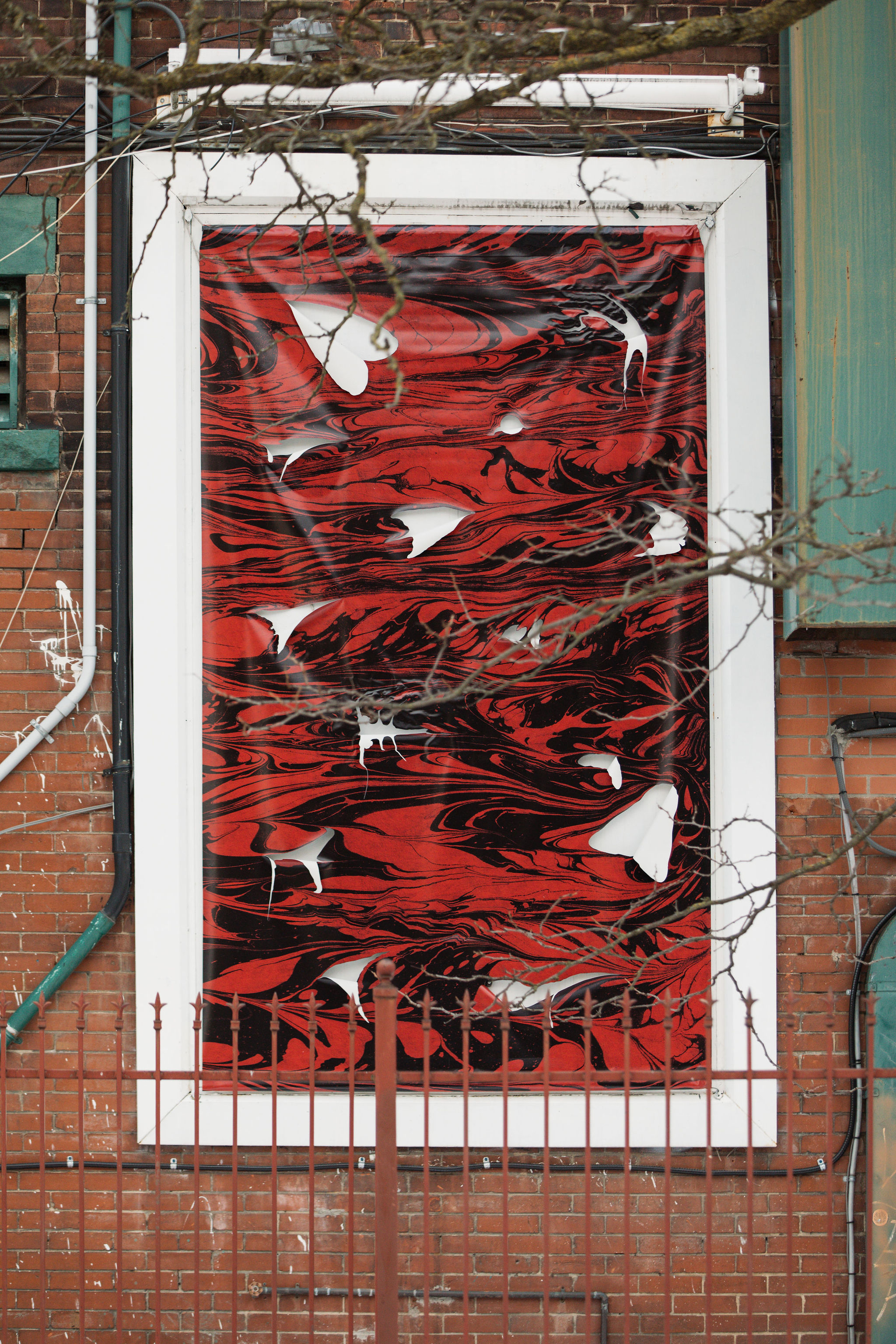 For Zorlutuna, Ebru speaks to the moment when land and water, hand and breath, touch in a process of co-becoming. In each of the three sculptural banners, careful incisions splay the image, breaking its membrane to release the movements humming within. As changing light, brushing wind, and beading water act upon the works’ surface, a kinetic dialogue begins with the natural elements that were momentarily stilled in each composition.