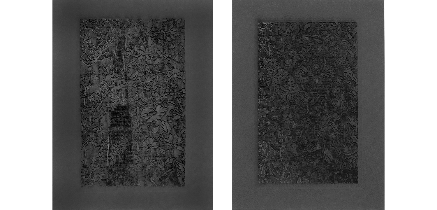 This pair of black laser etchings are based on a tracing Kubba drew of a document at the Stoddard-Templeton Design archive at the University of Glasgow. Their archive drawers house Victorian era tracings of Persian and other ‘Oriental’ rugs made by the designers at the Stoddard-Templeton factory. The archives mark a historic moment in the colonial appropriation of traditional crafts from British colonies into mechanized manufacture in Scotland.